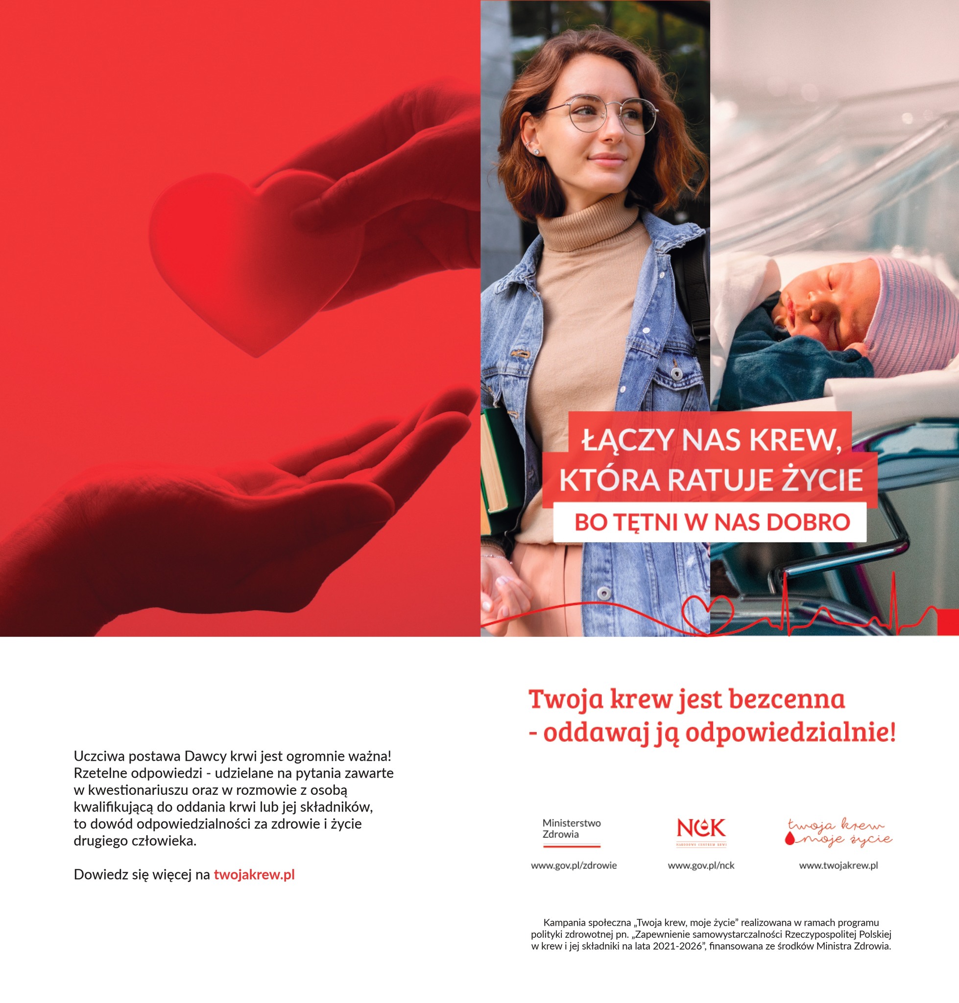 Ogólnopolska akcja promująca honorowe oddawanie krwi skierowana do ogółu społeczeństwa w zakresie okoliczności, które mają wpływ na honorowe krwiodawstwo została przygotowana w ramach ogólnopolskiej kampanii społecznej „Twoja krew, moje życie„, która jest realizowana w oparciu o program polityki zdrowotnej „Zapewnienie samowystarczalności Rzeczypospolitej Polskiej w krew i jej składniki na lata 2021-2026”.